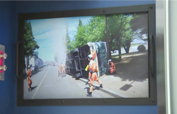 事故現場は、トラックとバスとが衝突して、バスが横転して多数の重症者がいるようだ。